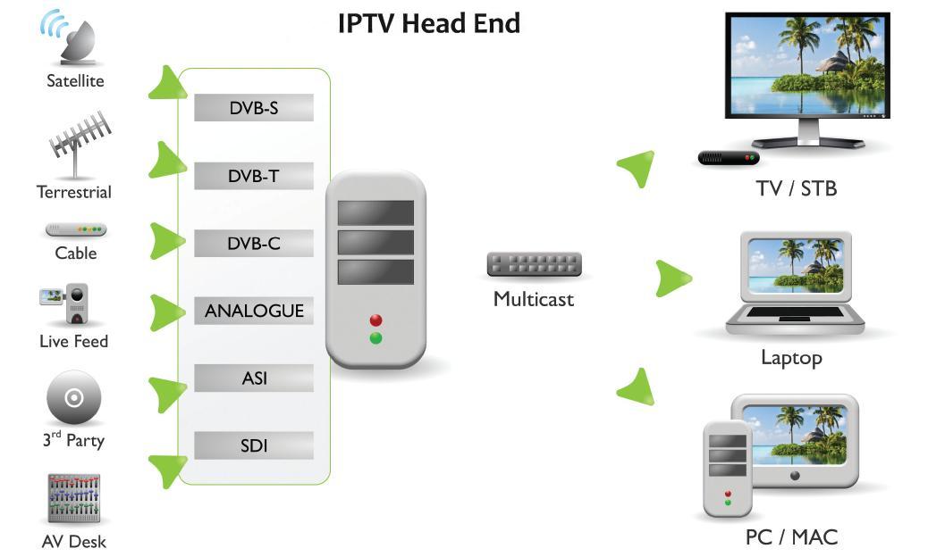 Interfaces are available for free to air and encrypted signals from a wide range of sources including digital satellite, digital terrestrial, digital cable, component analogue and professional digital private productions, via serial digital interface (SDI) and asynchronous digital interface (ASI), all supported through the IPTV platform either in Standard Definition (SD) or High Definition (HD).